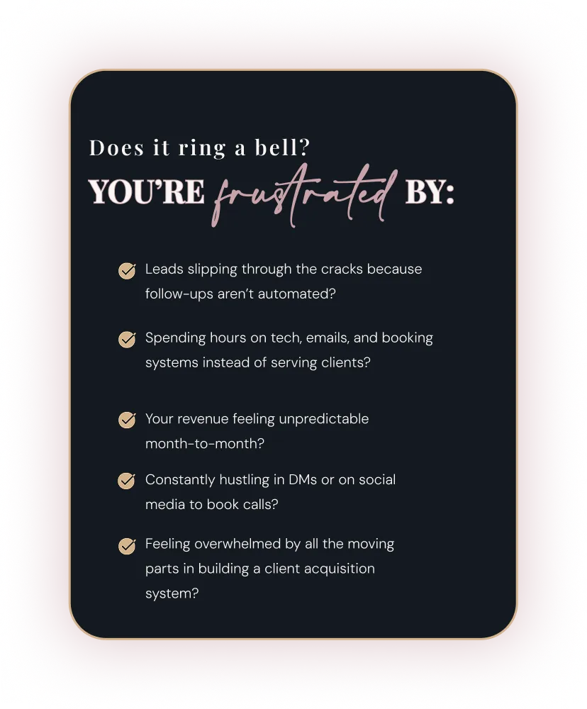 Think about it like this: Without a system, you're paying in: time wasted chasing leads, missed clients who never followed up, lost revenue from inconsistent bookings, stress + burnout from doing everything manually